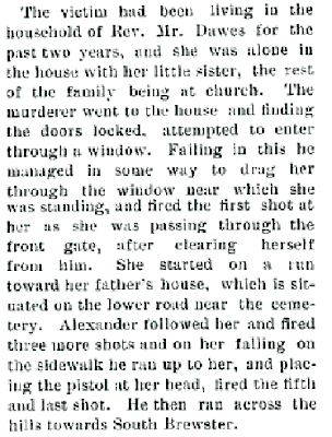 It was a Sunday. Pastor Dawes began reading the opening prayer at the Brewster Unitarian church. The sound of gunshots drew the congregation outside. They found poor Sadie dead on the sidewalk from a gunshot wound behind her right ear.