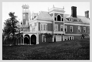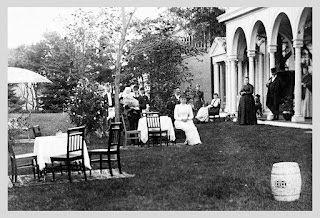 The front lawn of the mansion, Matilda dressed in white sits in the foreground.Legend says that when Albert needed to get away from all the lunches and parties, he retired to his rocking chair in the old homestead.