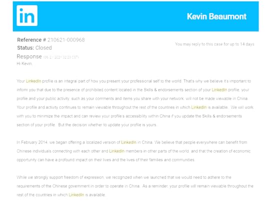 “We will work with you to minimize the impact and can review your profile’s accessibility within China if you update the Skills & endorsements section of your profile.”