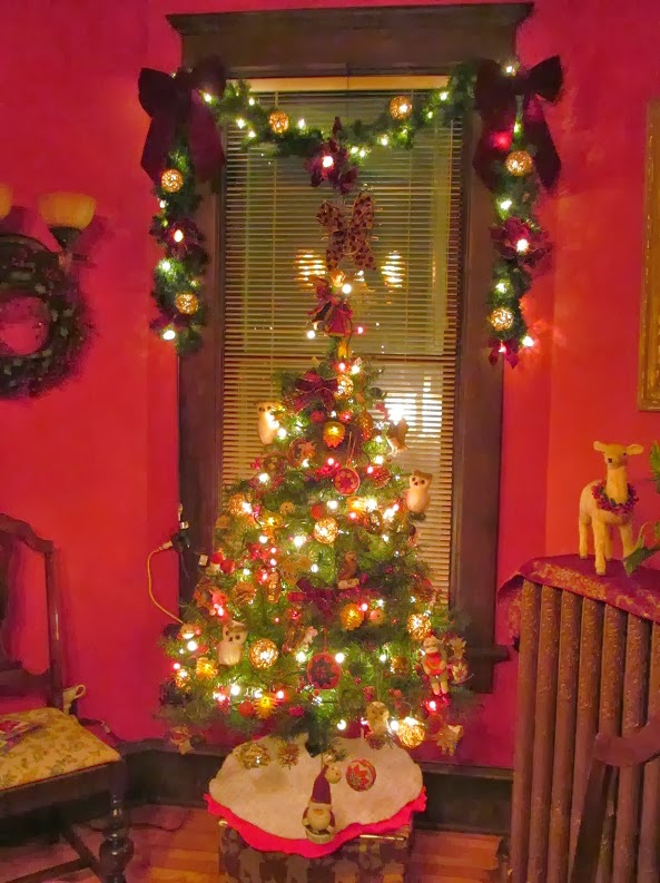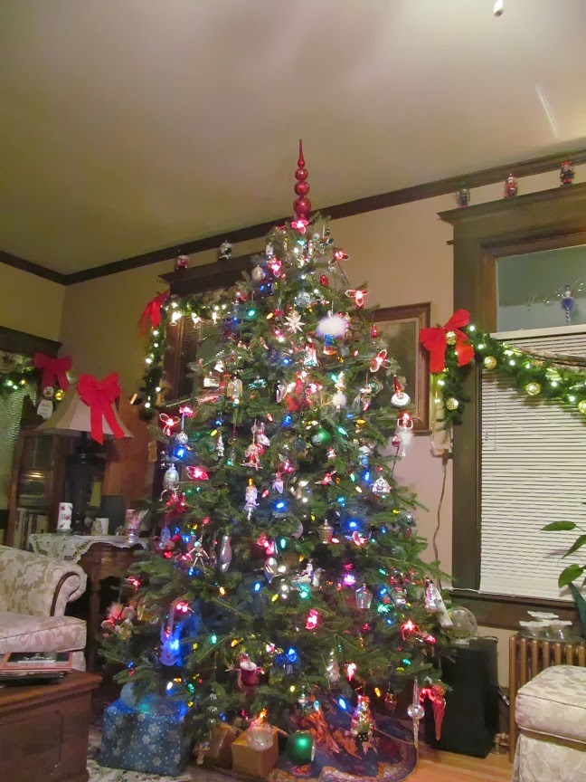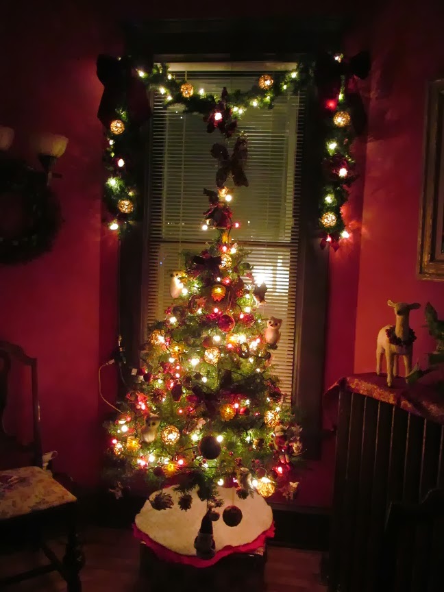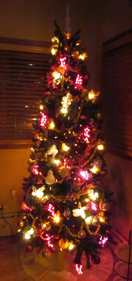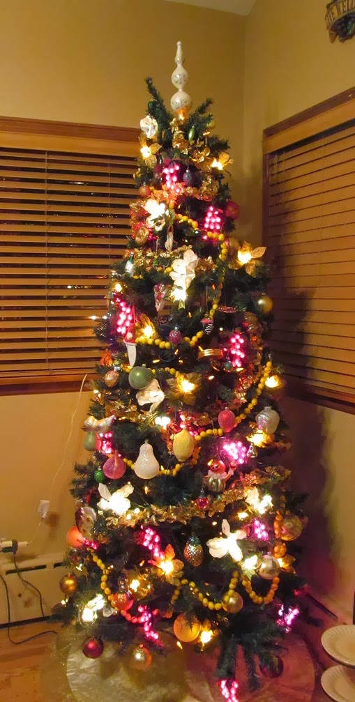 My husband and I love Christmas, and every year we enjoy decorating our house for the season. We scale back in the years we're not scheduled to host any gatherings, but this year we are having his whole family over for Christmas dinner so all the decorations are out. I thought it might be nice to share some pictures, so here are our trees, all decked out for the big day: