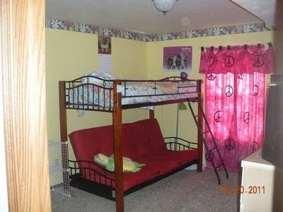 Here's Jana's room. She's into peace and kittens -- in case you couldn't tell. :D Oh, and in the bottom photo, the homemade poster by the door is all the cats she's loved and lost. Every time a family cat dies, she draws him/her into the poster. Isn't that sweet and sad? Looks like it's just about time for her to start another one, though I hope not. We're all really fond of Venchie, our current cat. She's the friendliest little cat ever.