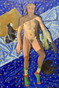 Linus Borgo, BED OF STARS: SELF PORTRAIT WITH ELSINA AND ZIP, 2021, oil on canvas, 46×68”.