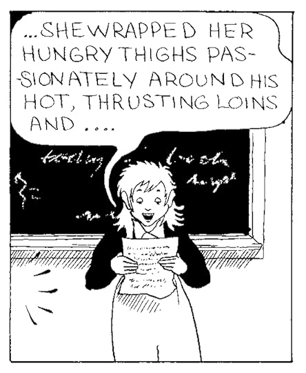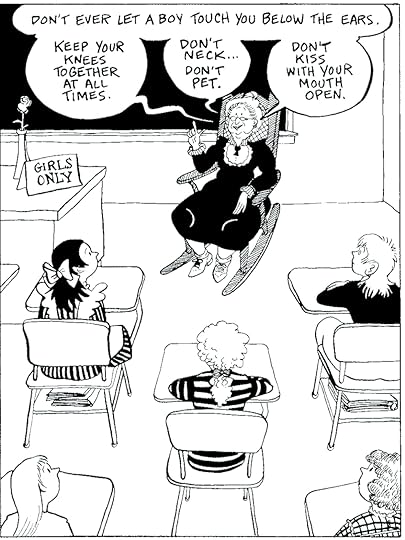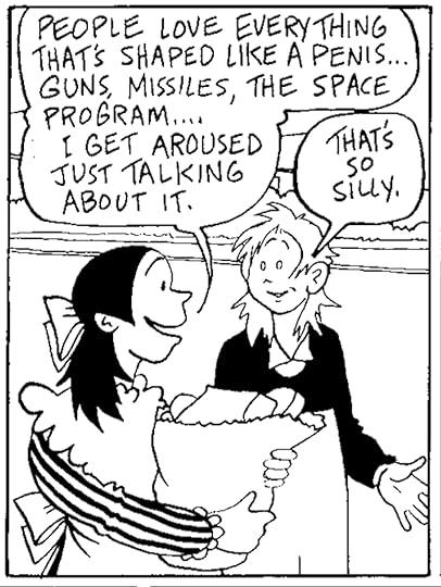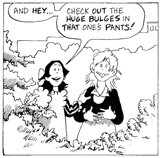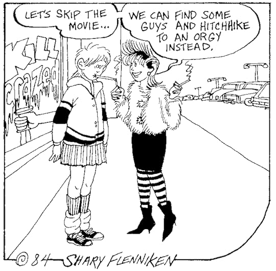 What Flenniken understands and brings gleefully to the page is that adolescent girlhood is positively feral and that teenage girls are both threatened and threats themselves. J. M. Barrie tells us in Peter Pan that children are “gay and innocent and heartless,” and that little weirdo had it right—that’s the terrible power of children, the monstrous innocence that makes them capable of anything, a state of being we fatuously describe as “pure.” You dump a bunch of hormones into a child’s body and all of a sudden you have this awful hybrid creature: a changeling with the self-centeredness and nonexistent impulse control of a child but the body and urges of a breeding-age adult. It’s a dangerous time in a young woman’s life, but as with most dangers, it has a messy, chaotic, super-hot fun side as well. To speak frankly of this fun side is tricky for adults, to say the least. We remember it, if at all, as a fever dream, a sticky, humid jungle of lust and stink. Grown-ups have to blind themselves to the sexual power of eighth-graders, for reasons I sincerely hope are obvious. But the kids can see each other head-on, and they wield their sexuality with all the grace and care of a toddler toting an AK-47. Flenniken dares to write and draw from that swamp with a complete lack of adult-world moralizing or editorial restraint. Arguably, “moralizing” and “restraint” weren’t really anyone’s bag when she was creating these strips, but there’s still an audacity in her work that I imagine felt as electrifying then as it does now.