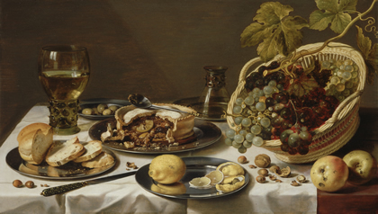 Pieter Claesz, Tabletop Still Life with Mince Pie and Basket of Grapes, 1625