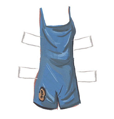 “My old high school tank suit … It still had the Putnam swimming team insignia on the right leg, and it was quite a beautiful color, sort of a blue-grey-green that it has arrived at through season of chlorinated water and full-strength sun”