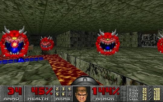 In the 2016 video game Doom (which I wrote about a year and a half ago), hell is an energy drink, a panic attack, a condemned corporate office park in space. In the game’s 1993 forebear, also titled Doom, hell is a methodically mapped but no less nightmarish procession of puzzles. Booting it up for the first time on my Nintendo Switch, I expected to encounter a mere historical curiosity, something I might play for thirty minutes before setting it down for good. As technology progresses and game design develops alongside it, the classics become further enshrined in the dust of memory, barely scrutable to future generations. Instead, I was thrilled to discover that the joys of the original Doom require no footnotes, no scholarly preface; immediately, the player is immersed in a cramped, bloody, pixelated approximation of the netherworld and asked to shoot their way out. The early levels challenge the player to learn the game’s language; the later levels spit out whole paragraphs at once, demanding complete fluency, an innate, twitch-level understanding of how each demon behaves, how quickly a rocket can collapse a distance, how much everything, absolutely everything, can hurt. Nearing my fortieth attempt at a mission in the game’s fourth episode, “Thy Flesh Consumed,” I couldn’t keep my hands, and then my entire body, from quaking. Stress-induced tremors are perhaps not the usual mark of a good time, but I promise that in this case, they absolutely were. As you’re reading this, I’ve probably found my way back to the game once more, flitting through the fields of one-eyed cacodemons, ducking the volleyed flames of imps, dancing to the howls of the barons of hell. —Brian Ransom