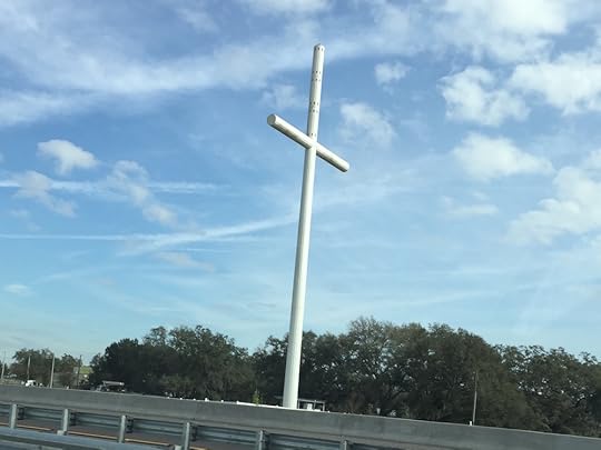 From the highway, the cross looks bright white and thin, almost delicate. Up close at the cell site, which is located between a grassy soccer field and a retaining pond, the steel poles look grayish and a little weathered. The tubular upright is enormous, bolted together in three large segments and slightly faceted. I know that the top is packed with antennae, amplifiers, relays, and cables. Standing close to the tower and looking up, I can see large ventilation holes in the upper segment and a small lightning rod sticking out from the very top, too fine to be visible from the highway. (Tampa is supposedly the lightning capital of North America.)