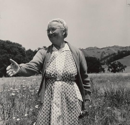 Everything in the picture affirms a sense of stability. The square photograph is bisected horizontally by the straight line where the flowering meadow joins the bare hill on the right and the tree-covered hill on the left that rise up from either side of her like wings. That line is even with her bosom, and her outstretched hand seems almost to rest on it. Her body is the vertical axis accentuated by the inset panel of her dress. It could seem like a moment in cyclical time, the time of the seasons and the years coming one after another, of the eternal return, and seen in isolation that might be all you’d know: an older woman with a radiantly kind face reaches out welcomingly from the heart of an idyllic California landscape.