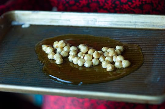 The last dish, a bonet, a traditional Piedmontese dessert since the thirteenth century, is a kind of baked chocolate custard, topped in Henry’s version with spectacularly pretty hazelnut caramel. This recipe worked well for me, but I’ve made caramel before. I know not to stir it, not to walk away at the end, and to pay attention to the direction that tells you to place a buttered cookie sheet next to the stove; also not to stick your finger in for a taste, and what shade of “amber” means it’s done. Know all that and it works like a charm. I made two small ingredient substitutions for the baked custard, one by using golden syrup instead of “golden caster sugar,” which was not readily available to me, and the other using strong brewed espresso instead of the instant kind, also on the premise that in simple dishes the ingredients that convey flavor should be of the highest quality.