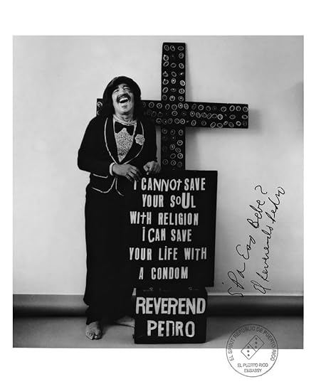 The Lost & Found chapbook, Condom Poems 4 Sale One Size Fits All, contains a tight selection of thirty poems—enough to open a window into that little-known moment in history. In a special envelope, Alcalay’s team has reproduced personal photos and hand-painted performance flyers from the archive, including one of the Reverend Pedro laughing, standing barefoot before a “condom cross.”