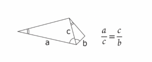 If the two extremes are constructed on a single straight line, the figure becomes a right triangle (since the angle between a and b becomes a straight angle, half of which is a right angle). The right triangle’s essential property is that it is formed by the juxtaposition of two triangles similar to it and to each other. I think that Pythagoras discovered this property first. The right triangle also provides the solution to the opposite problem: if the mean proportional and the sum or difference of the extremes are known, find the extremes.