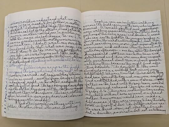 For many writers, it probably would be. But when Munro came up with this, she saw something else. While the scene lurched back to the time of the narrator’s childhood, what Munro had just done was write the first sentences of the story. The notebook visibly betrays her excitement. She immediately starts over, recasting the sentence in the third person—“Sophie can see her father walking across the field carrying the boy who has been drowned”—and then goes on, writing in a rush, not bothering with paragraph division as she fills in additional details. After that, the draft abruptly gives out, as if Munro she knew she had what she needed and could move on to a typed manuscript.