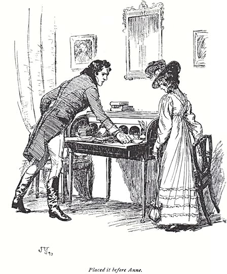 Hugh Thomson, engraving for chapter 23 of Persuasion, 1987: “He drew out a letter from under the scattered paper, placed it before Anne with eyes of glowing entreaty fixed on her for a time.” Public domain.