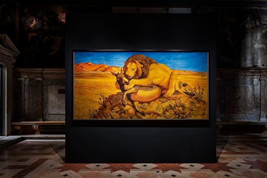 My first stop after depositing my bags and downing two espresso is Walton Ford’s Lion of God. The show takes up the two full stories of a church-like building in the same square as the city’s opera house, which my boyfriend is telling me—with the sort of walleyed zeal that suggests it’s one of a handful of facts he memorized for the trip—burned down in the nineties. Inside, it’s surprisingly dark, the main floor cut up by temporary exhibit walls painted black, the lights so dim that the details of the building, and the historic paintings spanning the rest of the room, are almost completely obscured.