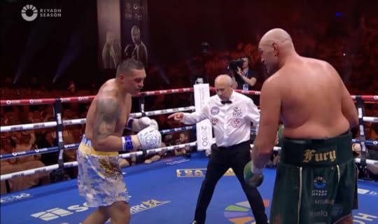 Usyk has had other, even bigger things on his mind. Usyk is Ukrainian and had, following Russia’s invasion, for a time been on the front line. Usyk was urged to return to the ring to give his nation’s beleaguered but resolute populace something to cheer, so he brought a steely purpose, albeit a divided attention, to the clash. He formerly operated in the weight division below heavy, cruiserweight, and had been a unified champion there before bulking up to enter the more lucrative land of the giants. Impeccably well drilled and increasingly squat and solid, having grown into his new big-man status, Usyk seemed unmoved by Fury’s usual erratic rants. He also seemed unmoved when Fury’s father headbutted a member of Usyk’s entourage on the Monday of fight week, serving only to bloody his own head in the process.