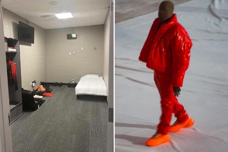 Beneath the spectacle of the first Donda shows, there was a twin bed in a small prison-style rectangular space, with a digital clock and a flat-screen television on the wall. One ex machina–esque fluorescent light beamed from the ceiling. The floor was carpeted in bureaucratic gray, and on it the contents of one small suitcase were neatly arrayed like they might be in a college dormitory. There were also some free weights, which made it all look lonelier and more honest. A gray wardrobe held a few hanging garments. Ye was filmed in that room leading up to the second performance, doing push-ups, huddled with his collaborators and affiliates listening to and editing songs for the album, and yelling militant rehearsal commands as the show approached, a look of messianic drive and casual terror in his eyes.