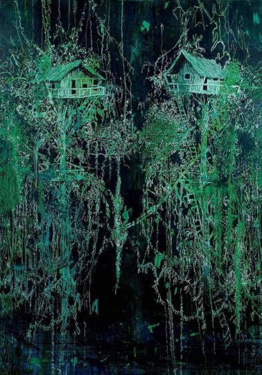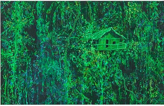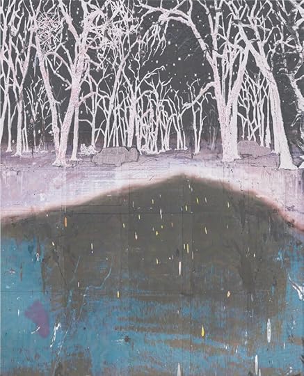 Staring at them, spacey, she thought perhaps she was seeing a painting. Her thoughts were filled with thinking of her children, of the future for children. The other day someone, another writer, who also had two children, had written to her, that perhaps they would all be living in the woods in five years, and she had thought of that, and somehow it got confused with the green overgrowth of the paintings she was thinking about. Away from some impending violence, and from the city, it was implied, and toward safety, although she knew, in that overgrowth, in those woods, there was violence as well. The next day her husband took the girls to the playground as she sat on the couch and tried to think about these paintings. She kept on being sent zip files to download of images of the paintings, even close-ups of the various textures, but they kept on disappearing because she would forget to look at them and then not know where the files had downloaded, so she kept on having to download them again. She couldn’t focus, clicking through the paintings on a screen, or focus on thinking about writing about painting, and she kept on refreshing the news over and over. She looked at a notebook, which also featured her children’s scrawled drawings and writings, and tried to read notes that she had written after reading an essay on writing about art that was written by a friend of hers. She couldn’t decipher most of her own handwriting, with its knots and swoops, like it was alien to her. There was a passage she had written down, “much like a tunnel or glittering vortex I’m talking about a pulling through of strangeness into strangeness,” and she kept thinking about this, about how to pull strangeness into strangeness. It felt like a connection she should follow, that she kept on reading about glitter. Was the glitter in the painting or the writing? What did this mean, glittery writing? She had wondered too, in this essay she was supposed to write, whether the paintings had to be in there. Should the paintings be here, in her writing? Or had they been diffused everywhere, in the atmosphere, in the air she breathed? She kept on trying to find these images of the paintings on her desktop and then chose not to look at the paintings or rather at the photographs of the paintings anymore. She needed to go outside.