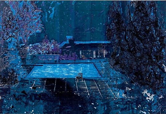 One day recently, during the baby’s nap, she had read a book on eeriness, which suggested that the eerie takes place within a silent and unpeopled landscape. Because she had been thinking of these paintings by this artist she didn’t know who lived elsewhere, on this walk she realized she was beginning to see the outside world like his visions, that it had taken on their strangeness. The landscape in which she was walking with her family that morning appeared to glow. In the novel she had been trying to read the night before, a woman keeps seeing a figure in green everywhere she goes, and reading it she thought that she’d love to write a text to attempt to speak to these abandoned landscapes that glowed green, like a strange green light. On their morning walk she remarked to her family that it was so strange that there was no one around. It was so silent out, except for birdsong. She had a thought—that the landscape they were walking through was like the paintings she was supposed to write about, except there was no birdsong in the paintings. Or perhaps there was, the thought continued, but she couldn’t hear it in the silence of the gallery in which she had originally seen them, with only the sound of her children and of her footsteps on the creaky wooden floors. On the long walk they passed almost no one else on the sidewalk, if anyone at all. Perhaps it was because it was morning, her husband remarked. Or perhaps the heat. Maybe everyone was inside, in the blast of air-conditioning already, having no desire for the outside. But there were still so many cars on the street, she replied. More likely those families who lived in the large houses went to other large houses on the weekend, especially for the holiday, large houses that were even more remote, more rural, even more beautiful. But when did they enjoy their gardens? Today, because of the holiday, there were none of the crews working outside, as there had been the day before, none of the fumes or roars of their lawnmowers and leaf blowers that were so noxious to walk by. She waved at a sole woman who was gardening outside, a sturdy homeowner who had most likely been in that neighborhood forever, before the change. The beauty and care of the gardens here always surprised her, especially in the intensity of early summer. There was a wildness to so many of them, especially now, at the peak, the overgrown rosemary, the reds and pinks of the rosebushes, the fragile tendrils of peonies jutting out. She knew that there was artifice to this wildness, that it was cultivated, but still she felt thankful for its beauty. Lately she had felt overcome by the visual splendor of the flowering trees outside of the large houses, the surprise to these full open flowers, almost obscene. It made her feel dizzy, or perhaps it was the heat. She hadn’t drunk enough water that morning, after coffee. The day before at the farmers’ market she had purchased two bunches of peonies, such as were flowering now, one fuchsia and light pink and the other pure white with speckles of pink. They had spent the day watching them, enjoying them, and wondering whether ants would be needed to open the few remaining closed bulbs in the bouquet. This morning her oldest daughter and her husband had placed an ant from the sticky kitchen counter on one of the flowers, as an experiment. When she had first seen the paintings of this artist, on the walls of a gallery, while she was wearing the baby, holding the hand of her daughter, she felt moved by them, especially by the flowering trees, embroidered with hectic and voluptuous clusters of red and pink thread. There were also all of his pool scenes, with the chlorinated light of the blue, that she thought of the day before, when they had proceeded on their walk in the other direction, toward the larger mansions near the park, and passed by the house on the corner where her daughter had attended a birthday party almost exactly one year earlier, as she had been in the same preschool class that spring with the boy who lived there, with his older brother and their parents. The preschool had taken place mostly in the park, in the style of forest school that became popular last year, and they were sent videos by the teachers of children, bored and hot, standing near a monument or excitedly playing in the nook of a tree. Her daughter had joined much later, and was an outsider to the group, but still was excited to be invited to the birthday party, especially because of the pool. The mother had been incredibly nervous, outside of her skin, for her daughter, who couldn’t swim, swim classes being almost entirely closed the past two years, and was swimming around in the artificially bright blue hole of water, with the shudder of its waves, and so she had purchased her a life jacket for the occasion and insisted she wear it. The horror and terror of the pool, and yet how inviting it was, its coolness. The father, who was much calmer about such things, was the one to take her, but then she joined with the baby later, wearing a long muumuu with painted flowers, walking by the blue-tinged hydrangeas that hadn’t appeared yet, so it must have been a little later in the year. When she came upon them at the party her daughter was so incredibly happy in the pool, her skin having that soaked, buoyant feeling children getwhen they are swimming, but she could hardly watch her, teeth chattering, swimming around and around in a circle, her life jacket not worn, clutching a pink foam noodle. What a luxury, to have a pool, she thought then, and also yesterday, as they walked by the house, past the gridded gate, and heard sounds of children playing and splashing inside, although they couldn’t see anything. Pools have to be fenced in, otherwise children would drown, her husband said to her in response, or something to that effect. It was the first time they had heard the family out in the pool that spring. When they got home from their wal