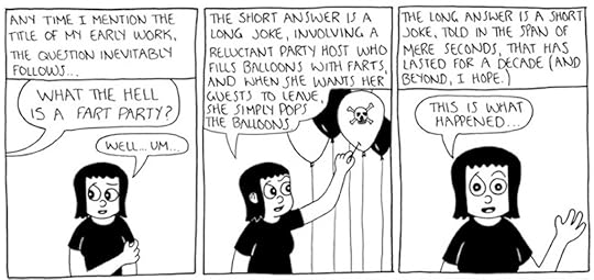 The early stories were drawn when alcohol worked for me. I write about it in a celebratory way, but if you look back knowing what happened to me later, you see that it’s excessive. I was also making an active choice during those years not to talk about the serious issues in my life, which were later covered in The Infinite Wait. My brother’s drug and alcohol addiction was slowly taking over my life, and I was sick. But in Fart Party, only every once in a while is there a panel that says, Oh, my brother fell off the wagon and got the shit kicked out of him but here I am, eating a cookie.