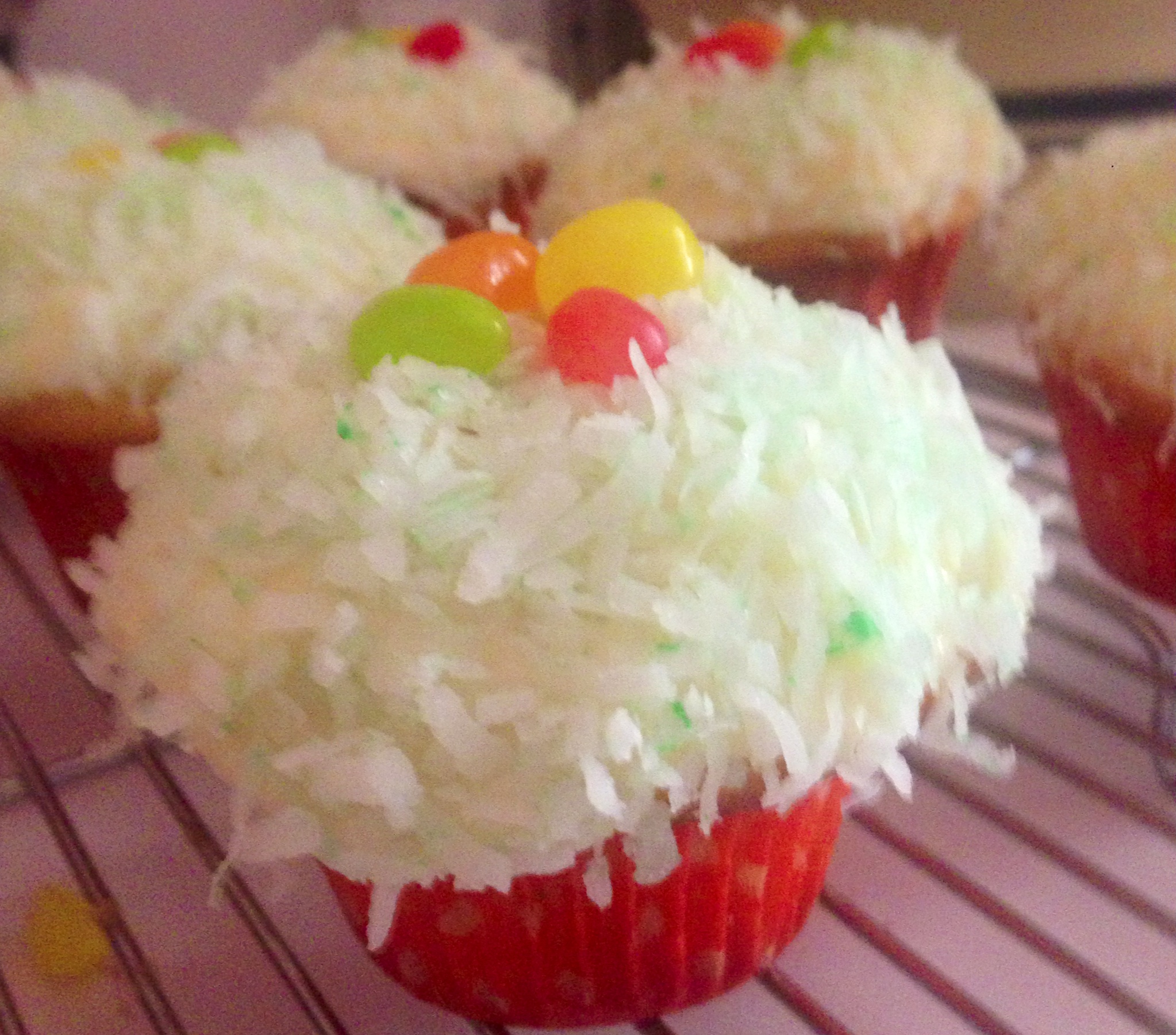 Yesterday I made some Easter-themed cupcakes, topped with cream-cheese frosting and dusted with green-tinted coconut. Within each nest, I placed four jelly beans. Brand: Teeny-Been. They were, if I do say so myself, pretty cunning.
