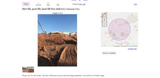 Dirt moves and circulates as part of its role in the man-made ecosystem of building, demolishing, and rebuilding. But there’s a paradox: the more that dirt is touched and handled by human hands, the more expensive it becomes to move around. If you bring “non-native” soil to a construction project, you are subject to costly soils testing. When a project has tight specifications—public libraries, for instance, have highly regulated dimensions and measurements—leftover dirt becomes surplus material. And you can’t simply throw it out. Disposing of dirt in Southern California is a long, bureaucratic process, one San Diego landscaper told me; one must apply for a permit to dump excess dirt and must transport it in a vehicle of a particular class. Some construction companies have even turned to posting their excess soil inventories online via dirt-matching sites. (“Connecting people who have dirt with people who need dirt,” reads the ad copy on DirtMatch.com. They boast 5,914 matches in the last ninety days.) For the homeowner who just wants to build up the ground around their new in-ground pool or the young couple working on the raised beds in their vegetable garden, all of this is expensive and time-consuming. And so they turn to Craigslist, and to the world of free dirt.