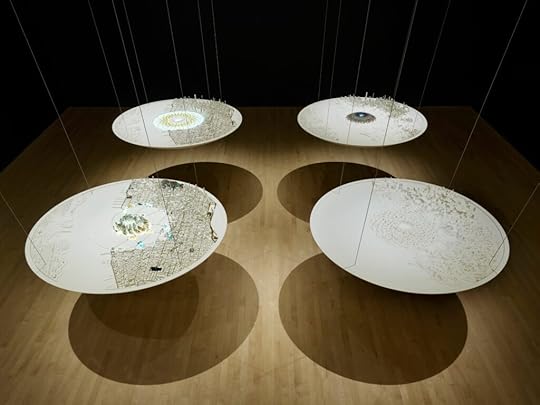 At SFMOMA two different kids asked the adults with them, “Is this all of San Francisco?” I watched a couple try to guess the city. The woman said it looked like New York. The man said, “It’s not Chicago,” which was funny to me. It was easy to miss the wall text—for some reason printed on what looked like tracing paper—which included the projected temperature and sea level rise for each subsequent model and said: “OXMAN, based in New York’s populous Manhattan borough, revisited the precolonial history of the local terrain, when it was known as Mannahatta (‘land of many hills’), identifying a period of rich biodiversity. In the four site-specific models on view here, OXMAN envisions an ecological evolution in which Manhattan’s urban grid and Mannahatta’s biotic garden achieve symbiosis.” The model shows climate change and a way out of it, or at least the recovery of the built environment by the natural world. But something makes it hard to read.
