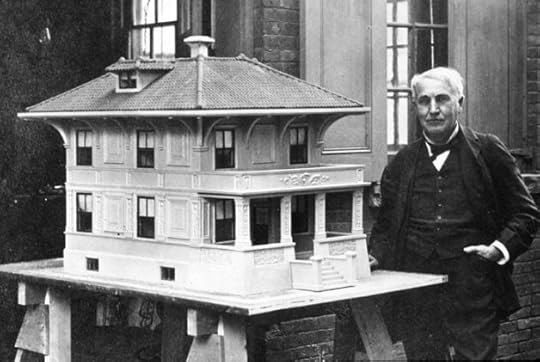 Film has always tangled with architecture and invention. In 1888, Eadweard Muybridge took his pictures of horses in motion to the New Jersey laboratory of Thomas Edison. Soon after, Edison filed a patent for the kinetoscope, an early moving picture machine. William K. L. Dickson and William Heise made the first film for the Edison Manufacturing Company in 1892. Around this time Edison was bought out of General Electric and started the Edison Portland Cement Company. He made designs for concrete homes that could be built with a single pour, which Edison described as “the most wonderful advance in science and invention the world has ever known, or hoped for.” The houses would be affordable, fireproof, and made on site. There is a photograph of the inventor next to a two-story prototype with a covered porch and balcony, windows evenly spaced, and decorative molding. Edison wears a dark suit, his tie askew and his left hand in his front pocket. Man and his little house.