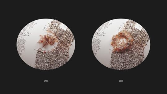If you went to the Museum of Modern Art in San Francisco this spring you could see a big small thing, a model that imagines what Manhattan will look like in 400 years. Actually Man-Nahāta is not one model but four, which hang in a square. Starting at the bottom left and walking clockwise you see a version of the city every hundred years, beginning in 2100. Emergence, the first in the series, is a grid of streets and skyscrapers, except for where an organic glassy form appears in Central Park, black and yellow and blue lit from below, awful. In Growth (set in 2200) the form expands in concentric and overlapping spirograph shapes, an almost periwinkle blue at the edges, rippling amber toward the center, where it calcifies into hills. By Decay (2300) it flows back, leaving edges of buildings made soft, eroded into shapes like melted candles. In Rebirth (2400) the built environment is overgrown, peaks and valleys where a city used to be, made of white chalky photopolymers and fiberglass.