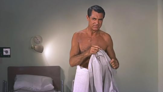 During the COVID confinement and afterward, I watched around sixty films starring Cary Grant. What a comfort to have him in my mind before I slept. No matter if he is comic or desperate, self-possessed or wounded, romantic or cool, he is ridiculously good-looking and seems never to know this. I love it when he puts his hands on his waist and pushes his hips forward as if about to dive or perform some acrobatic trick. His slim, athletic torso and long arms are always tanned. Sometimes he wears a fine shimmering gold medal around his neck. I love his dark eyes that have not forgotten his youthful suffering. He makes me laugh when he rolls his eyes around with his own special brand of sophisticated nonchalance. Though he isn’t aggressive, he doesn’t seem weak either. I find him buoyantly masculine. I can’t resist watching him. A few days ago, on a flight to Los Angeles, I watched Alfred Hitchcock’s hugely entertaining thriller North by Northwest again. Grant was fifty-five when he made this film and long past his box office peak in the screwball comedies that made him famous. In the Hitchcock film he wears a nice-fitting, light gray suit with a gray silk tie and cuff links. The suit gets dirty, sponged off and pressed, then dirty again. Grant’s hair is a little gray, too. I don’t wear ties anymore, but I would wear a tie worn by Cary Grant. North by Northwest appeared in 1959, around the time that he was experimenting with medical LSD and searching for more “peace of mind,” as he called it. I don’t really know what a great actor is, but I think Grant is sensational.