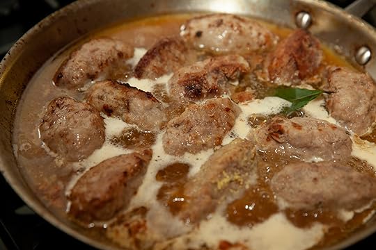 Heat a generous amount of oil in a large skillet, add the cutlets, and fry until browned on all sides. Pour in the two cups of chicken stock, add the bay leaves, and bring to a boil. Cover and simmer for fifteen minutes.
