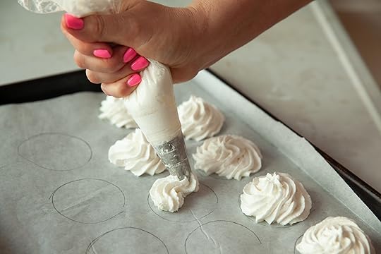 Fill the piping bag and pipe immediately onto the prepared sheets, making 2.5-inch rounds. Set out to dry for eight to ten hours or overnight.