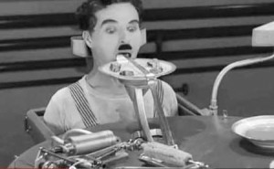 The opening scenes of Charlie Chaplin’s Modern Times demonstrate the indignities mechanized factory production perpetrates upon the bodies of its workers. The first shot, of sheep herded into a pen, dissolves into one of men leaving the subway. They’re bound, the viewer assumes, for the kind of job in which the next cut finds Chaplin’s Little Tramp: working on an assembly line, his motions so repetitive that they become reflexive. He can’t stop twisting his wrists, as if to tighten bolts, even when he leaves the station where he tightens bolts all day. His body is so bound to the line and to the factory that the same boss who controls the conveyor belt’s speed also controls the movements of the Tramp’s body. Finally, the factory extends its control to the Tramp’s last autonomous function: eating his lunch.
