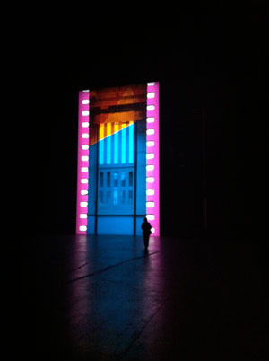 FILM, was itself a loving tribute to the medium. Rather than a frustrated attempt to stop time and rewind back to technologies of the past, Dean argued for the co-existence of digital and analog, emphasizing the difference. The silent film on a loop is a series of images from around the Tate. Its elevators, escalator steps, windows and other ordinary surfaces are manipulated with bright colors and cut-out shapes projected vertically on a giant perforated filmstrip 42 feet high. To see the dust and grain of the film, watch shadows puncture the image as people pass, to listen to a projector purr; is to appreciate the very physical nature of film.