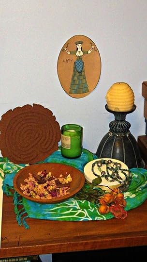 All you really need to start is a flat surface – a large stone for outdoor rituals, a tabletop or bookshelf indoors. We make the temporary altars for our seasonal rituals on a picnic table when we’re outdoors and on the coffee table in the living room if we’ll be inside. My Ariadne altar is a long-term installation; it fills up a portion of my desktop in my office. I also have several altars to deities and ancestors in various places around the house – on bookshelves, the fireplace mantel, a little shelf on the headboard of my bed. Most of them look like interesting collections of knick-knacks, so people who aren’t pagan wouldn’t necessarily recognize them as altars.