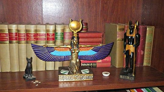 My Egyptian altar; it sits on a bookshelf in my living room.