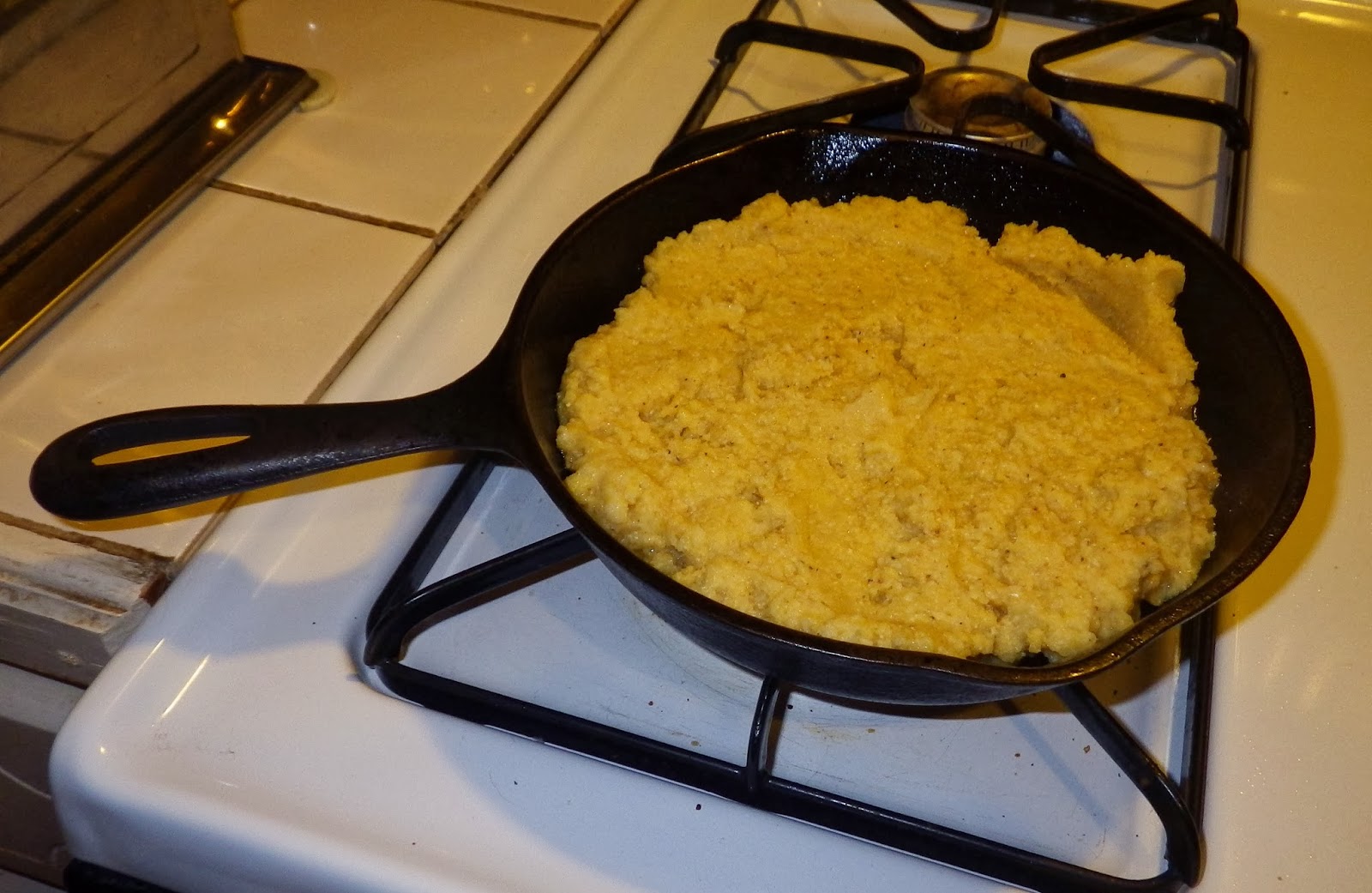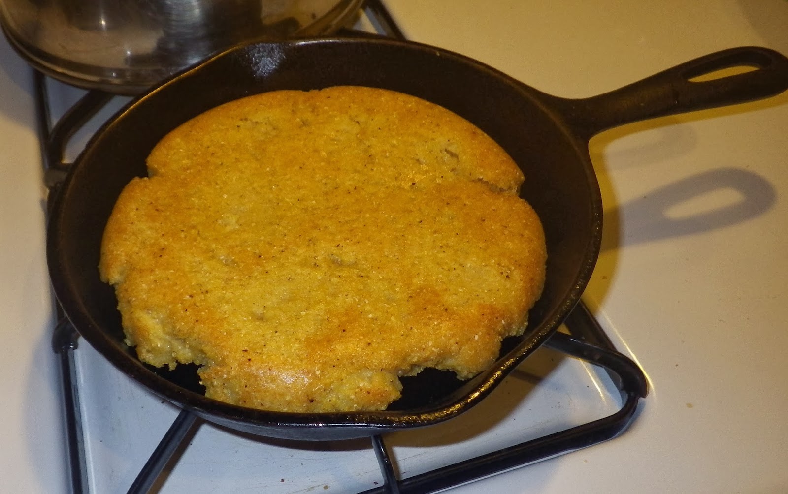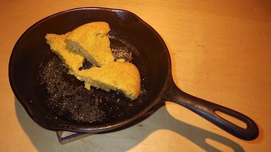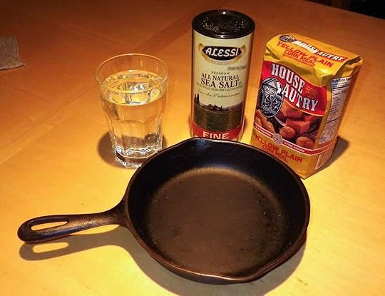 Though Grandpa was happy to dispense with his local/native heritage as far as society was concerned, he hung onto one tiny aspect: the cornbread. Grandma made cornbread the way he liked it, which was very much the way the local native people cooked it. This ‘corn cake’ contained just three ingredients: plain cornmeal (NOT self-rising cornmeal mix), water and salt. The equipment: a kettle, a bowl and a well-greased cast iron skillet. The result: the crispiest brown crust surrounding a moist, creamy center.