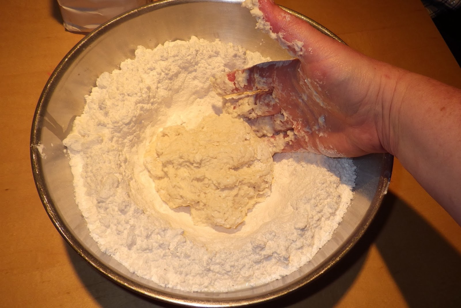 Grandmother kept a ‘working amount’ of flour in a wide, shallow wooden bowl that she stored, covered with a cloth, in a kitchen cabinet. When it was time to make biscuits she brought the bowl out of its storage place and made a well in the middle of the flour with her knuckles. She always computed out loud how many people she had to feed for that meal and always managed to make exactly the right amount of bread, no matter how empty or full the table was.