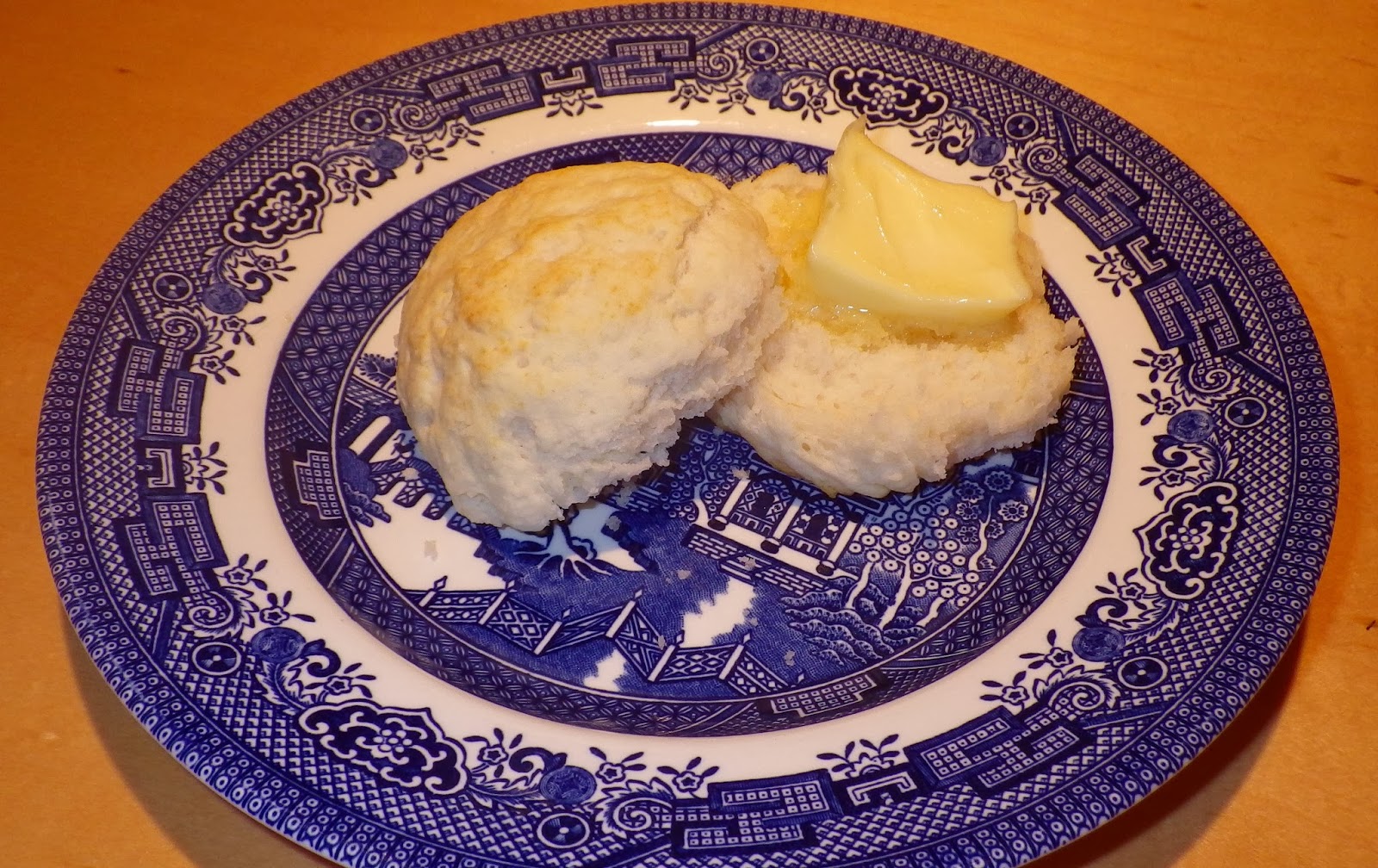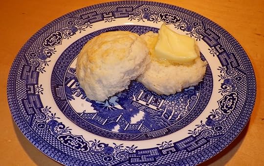 Grandmother always disliked butter, a legacy of being the youngest girl in her family and therefore being stuck with the responsibility of churning the butter every week until she left home to get married. As soon as she could afford it, she started buying margarine and that’s what I remember at her house, what I always had on those biscuits she baked. But I prefer butter and I even enjoy churning it, never having had that job imposed on me by someone else. So I’m serving these biscuits with butter; I think Grandmother would understand. I even had one for dessert, drizzled with honey (I’m fresh out of the kind of cane syrup they always had on the farm, made from the sugar cane they grew on the land – the closest facsimile that’s available around here in north Georgia is sorghum).