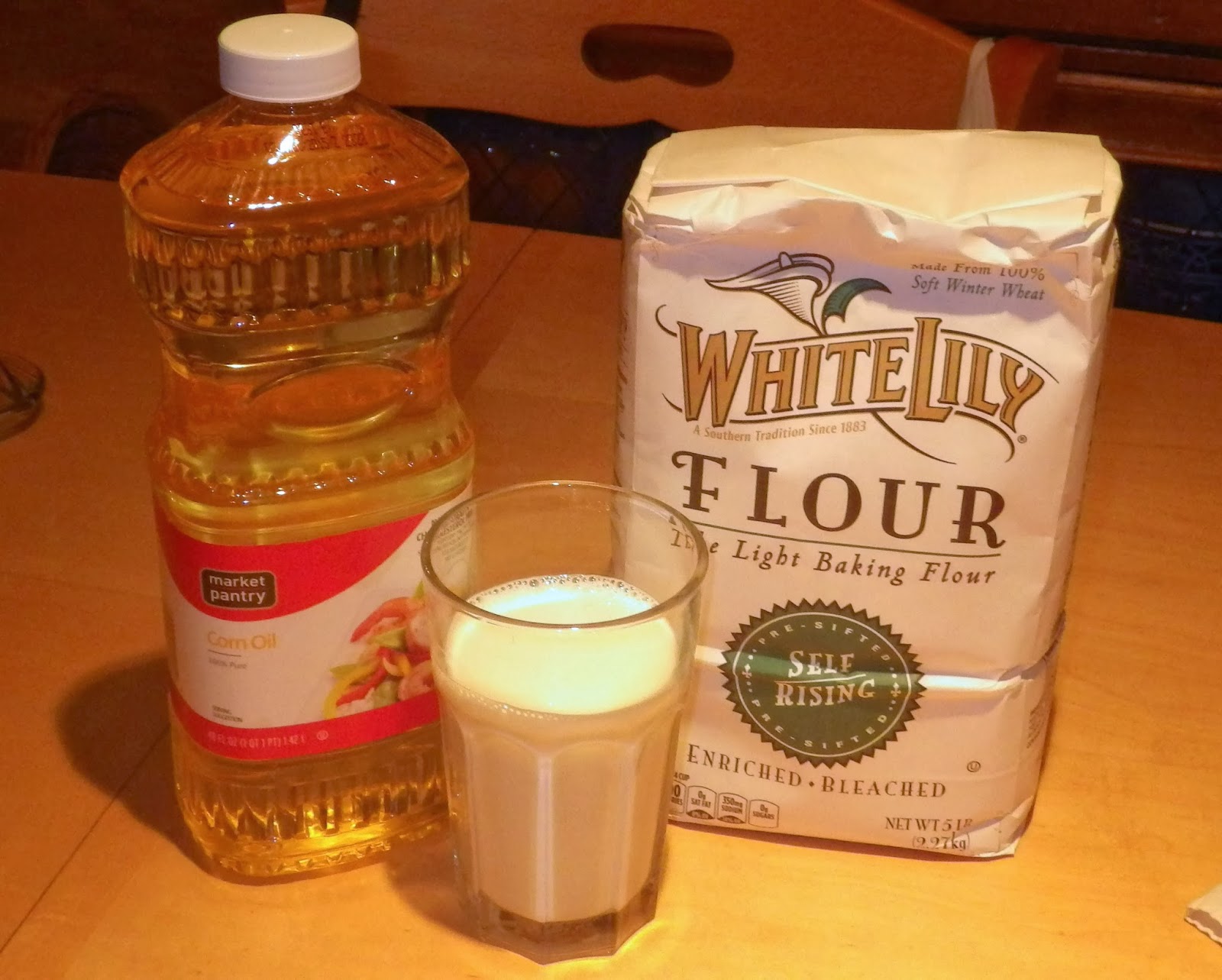 Though Grandmother made cornbread from the grain she and Granddaddy grew, her usual bread was biscuits. Like many other rural women, she bought her flour in large fabric sacks and reused the material to make clothes and quilts. I can’t use up 25 pounds of flour nearly as fast as she could – I have only a husband and daughter to feed; she fed a husband, five children and any number of relatives and friends who worked as farm hands during the busy season. But I have chosen her brand of flour, White Lily self-rising, in an effort at accuracy. Grandmother used corn oil, the store brand from her local IGA grocery, in her biscuits so I have chosen the house label from my usual supermarket.