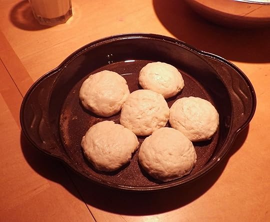 Into that well in the middle of the flour she poured corn oil and milk, estimating the correct amount by eye. She used about twice as much milk as oil. Then she stirred up the dough with her bare hand, gathering in just enough flour to make a very soft dough. When I have attempted her biscuit method in the past, I’ve always ended up with biscuit-flavored hockey pucks. I think I was drawing too much flour into the mixture, so this time I was careful to stop mixing while the dough was still soft.