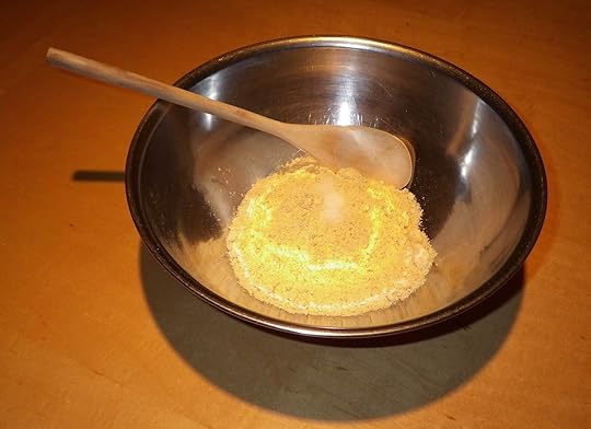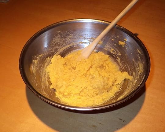 For this size pan, I’m going to use one cup of cornmeal with half a teaspoon of salt stirred into it. That should give a fairly thin pone like the ones Grandma turned out. I’ll mix the batter in a metal bowl that won’t be harmed by the heat of the boiling water as I pour it in. I’ll eyeball the water amount like Grandma did, stirring it in as I pour, until the batter reaches the right consistency.