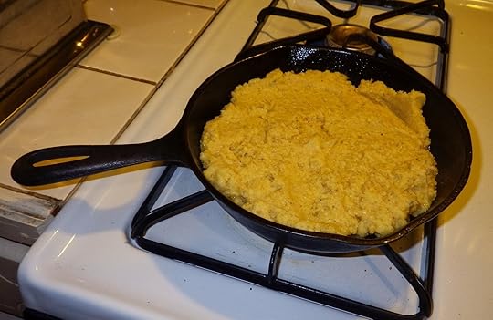 Like all the other farm folks in that time and place who grew Silver Queen and related strains of field corn, Grandma Crews always used white cornmeal. My local grocery doesn’t carry white cornmeal and I haven’t had the time to travel up to the Nora Mill to buy some of the real, stone-ground stuff, so I’m going with the plain yellow cornmeal I can get close to home. The next time I can get my hands on some stone-ground white cornmeal, I’ll make Grandma’s cornbread again.