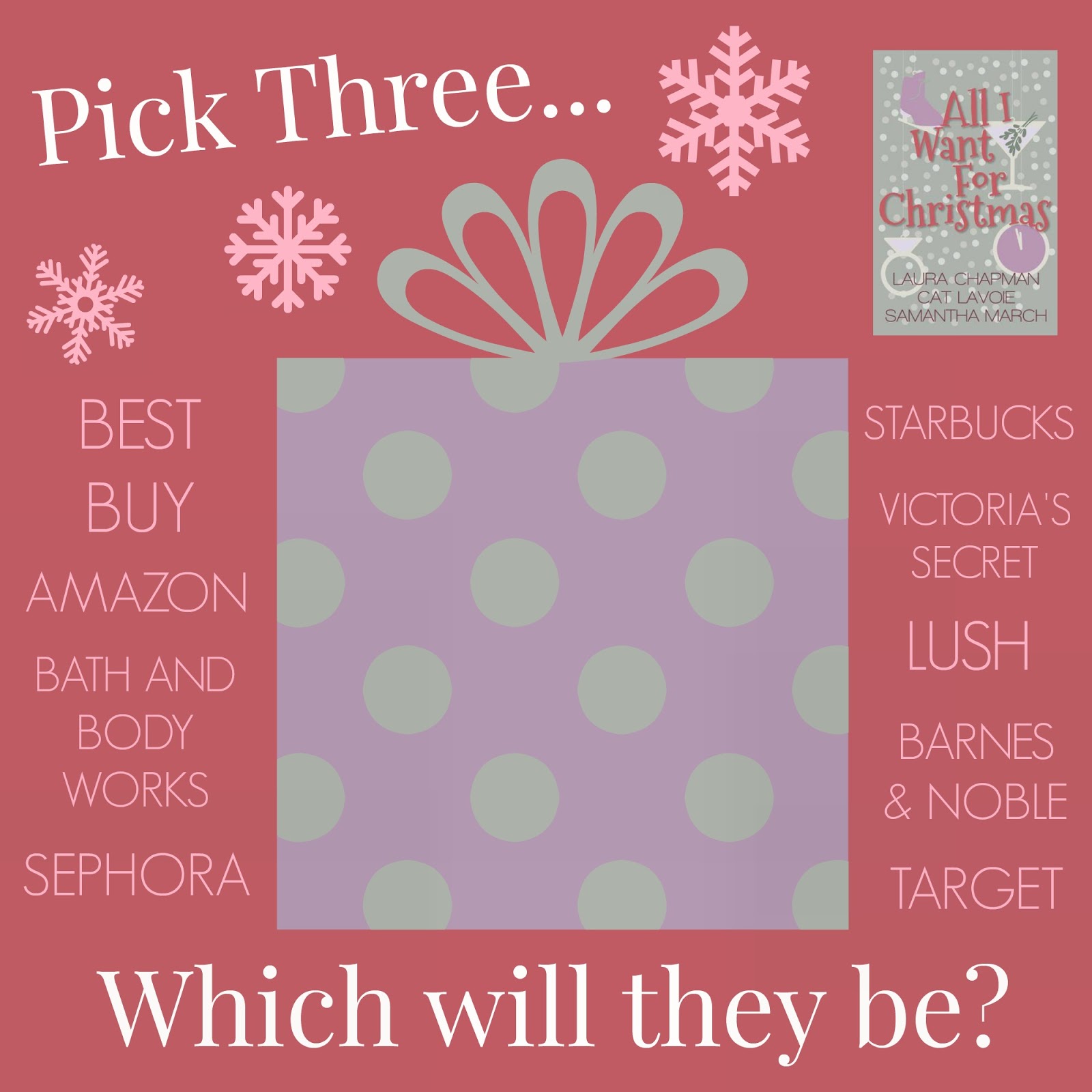 Be sure to enter the giveaway for a chance to win three $10 gift cards from Cat, Samantha, and me. Entering is easy--just complete the Rafflecopter below. Just in time for the holidays, the winner will get the chance to pick out three gift cards from the following stores: