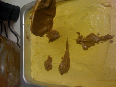A crappy photo of me adding dollops of brownie batter to the top.DirectionsGrease 13 x 9-inch pan and preheat oven to 350 degrees. To make the cream cheese filling, mix together softened cream cheese, brown sugar, and white sugar. Add canned pumpkin, egg, vanilla, pumpkin pie spice, and flour. Set aside. To make brownies, melt chocolate chips and butter in a sauce pan. Add salt, sugar, eggs, vanilla, and flour. Pour in a pan saving back 1 cup for later. Pour pumpkin cheesecake batter on top. Add dollops of remaining brownie batter and swirl to create a marble effect. Bake for 45-50 minutes. Allow to cool before serving.