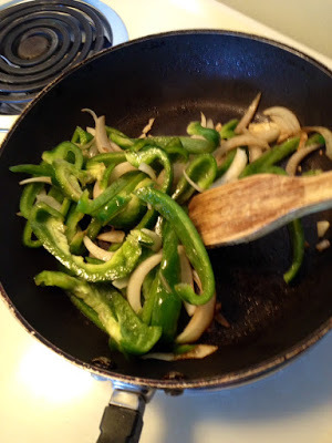 Mince two cloves of garlic and slice half a large onion and 1 green pepper with longer pieces. Spray pan with non-stick olive oil spray and heat pan over medium heat.