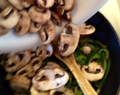 Add onion, pepper and garlic. After a few minutes add sliced mushrooms and as much black pepper as desired.