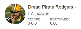 Team 1: Dread Pirate RodgersMotto: Good work. Sleep well. I'll most likely kill your team on the field this week.