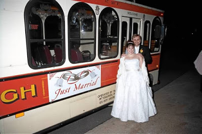 We got married on a Friday night that October. It was just us, our parents, our siblings, his grandparents, and my matron of honor (the only non-family member). My husband’s father was the best man. It was perfect. I remember giggling a bit during the ceremony. I remember all the pictures. I remember my husband’s smile as I walked down the aisle. I don’t remember the readings or the songs. But I remember both of us smiling the whole time. After the ceremony and pictures, we rode the trolley we rented to dinner at the same restaurant that we celebrated our engagement. It was a wonderful night.
