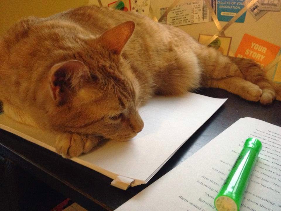 After finishing up another round of edits for Book 2, I decided to rearrange my office and do some organizing to procrastinate starting work on my next project. I've tried three different office arrangements in my new-ish apartment, and this is my favorite. This arrangement gives me a view out of my balcony, but also keeps the desk far enough away from the window so I don't have to fight my cats for custody of the desk.
