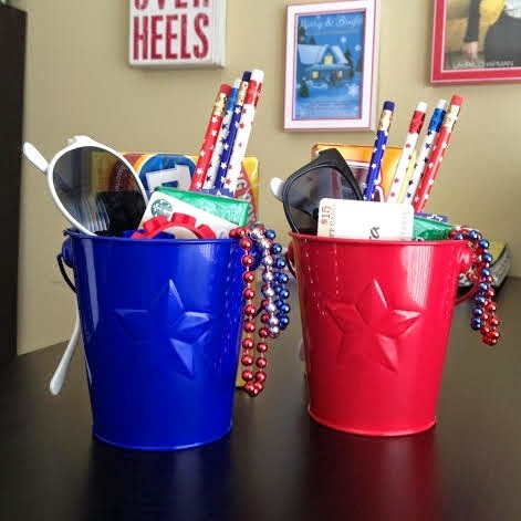 Since my birthday falls on Flag Day (June 14), each prize is Flag Day themed. In addition to containing some red, white and blue flare, sunglasses and candy, each also has a $15 gift certificate to Panera or Starbucks. Panera and Starbucks are two of my favorite places to write, and this really is all about me, so... ;)